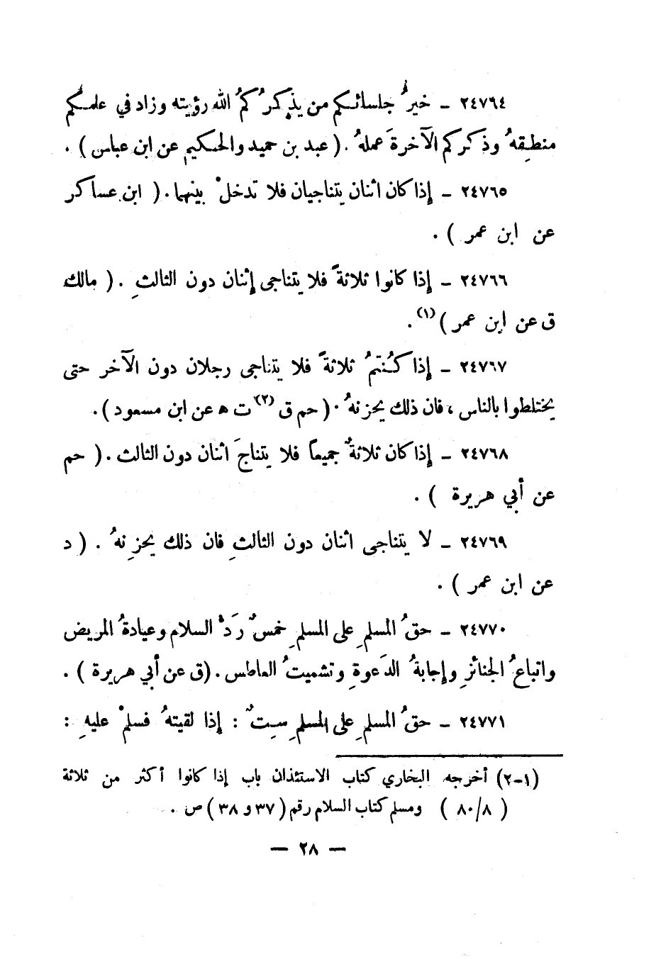 24766- "إذا كانوا ثلاثة فلا يتناجى إثنان دون الثالث". "مالك ق عن ابن عمر" 1