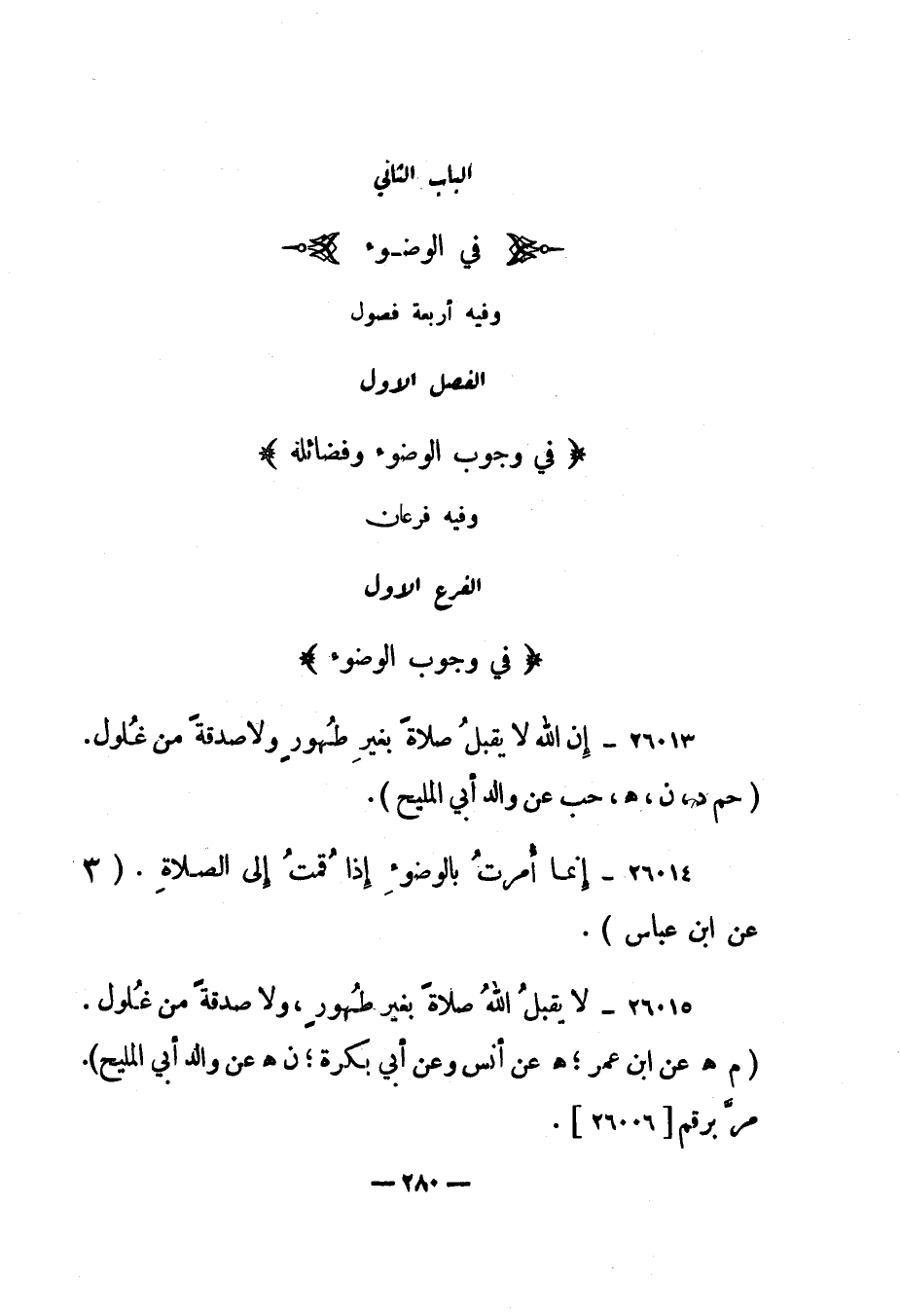 26015- "لا يقبل الله صلاة بغير طهور، ولا صدقة من غلول". "م هـ عن ابن عمر؛ هـ عن أنس وعن أبي بكرة؛ ن هـ عن والد أبي المليح". مر برقم [26006] .