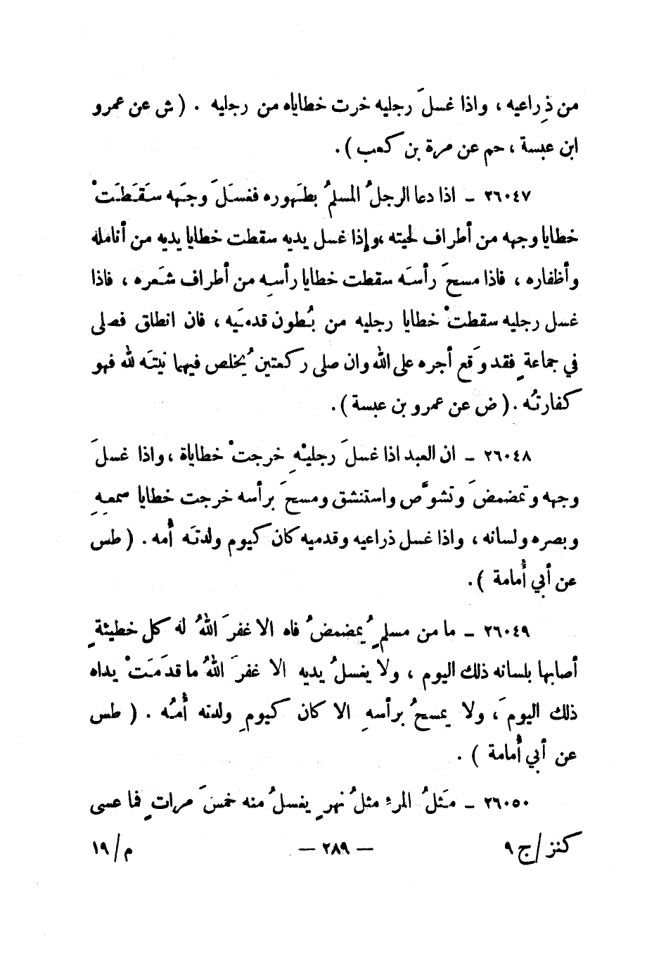 26047- "إذا دعا الرجل المسلم بطهوره فغسل وجهه سقطت خطاياه وجهه من أطراف لحيته، وإذا غسل يديه سقطت خطايا يديه من أنامله وأظفاره، فإذا مسح رأسه سقطت خطايا رأسه من أطراف شعره، فإذا غسل رجليه سقطت خطايا رجليه من بطون قدميه، فإن انطلق فصلى في جماعة فقد وقع أجره على الله وإن صلى ركعتين يخلص فيهما نيته لله فهو كفارته"."ض عن عمرو بن عبسة".