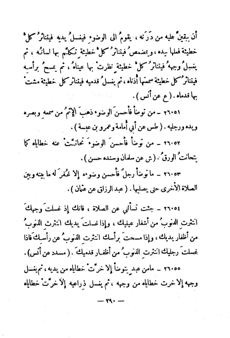 26053- "ما توضأ رجل فأحسن وضوءه إلا غفر له ما بينه وبين الصلاة الأخرى حتى يصليها". "عبد الرزاق عن عثمان".