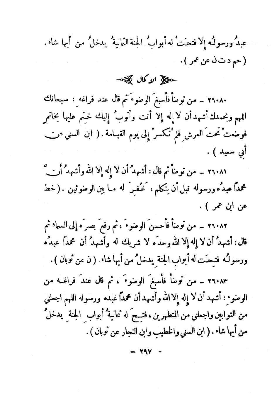 26080- "من توضأ فأسبغ الوضوء ثم قال عند فراغه: سبحانك اللهم وبحمدك أشهد أن لا إله إلا أنت وأتوب إليك ختم عليها بخاتم فوضعت تحت العرش فلم تكسر إلى يوم القيامة". "ابن السني عن أبي سعيد".