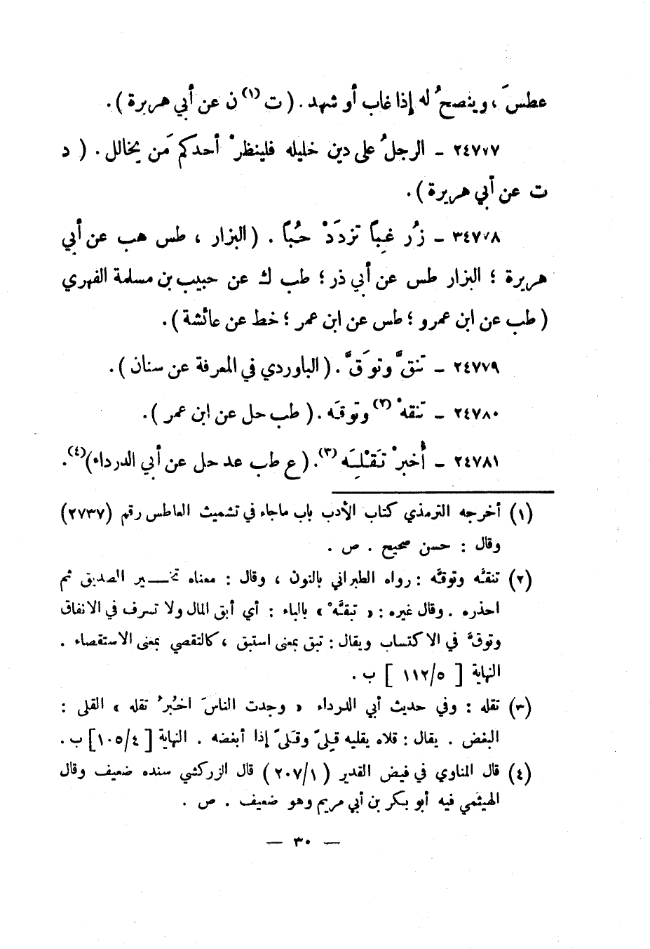 24778- "زر غبا تزدد حبا". "البزار، طس هب عن أبي هريرة؛ البزار طس عن أبي ذر؛ طب ك عن حبيب بن مسلمة الفهري، طب عن ابن عمرو؛ طس عن ابن عمر؛ خط عن عائشة".