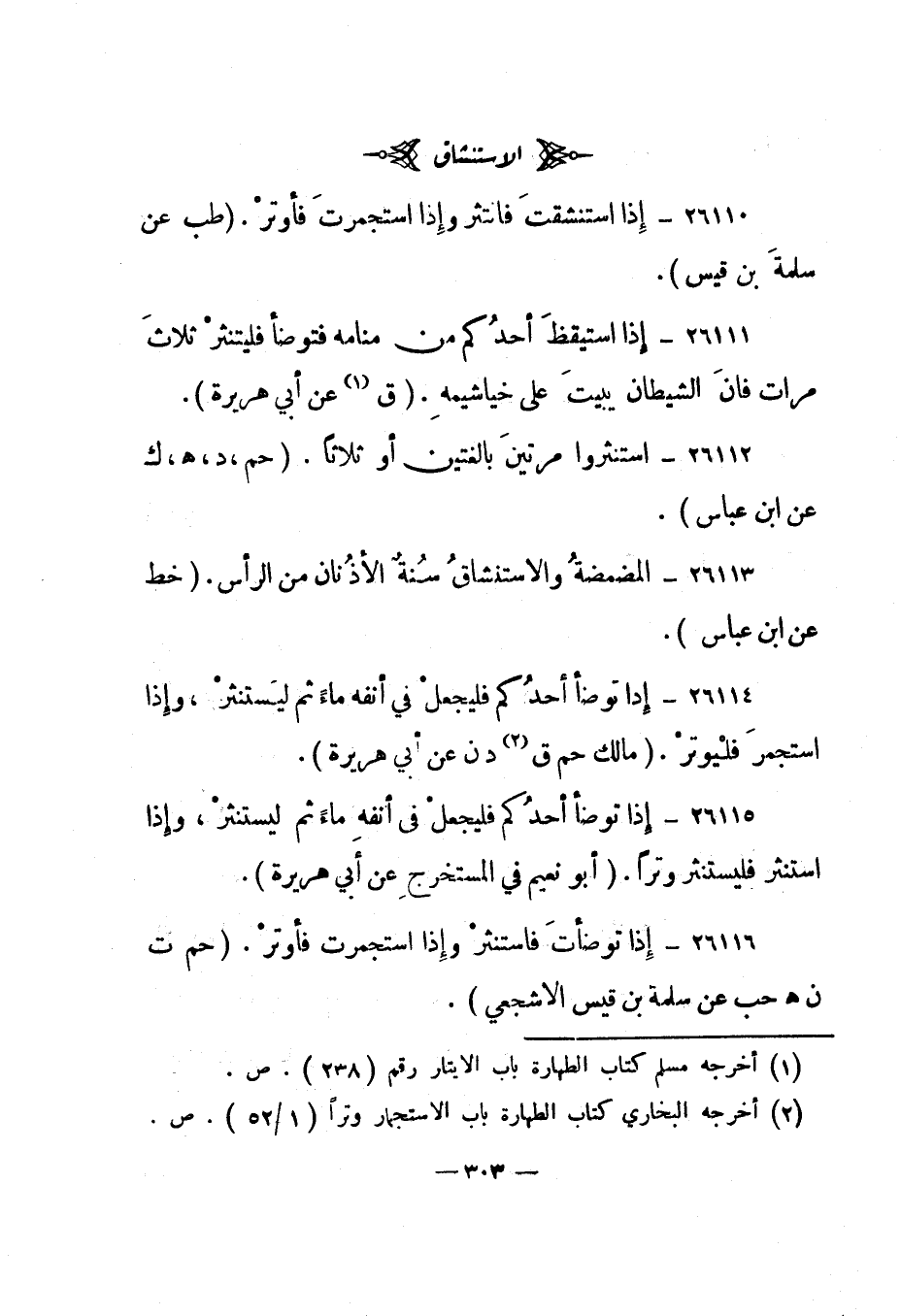 26116- "إذا توضأت فاستنثر وإذا استجمرت فأوتر". "حم ت ن هحب عن سلمة بن قيس الأشجعي".