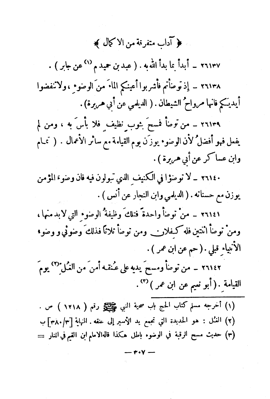 26142- "من توضأ ومسح يديه على عنقه أمن من الغل 2 يوم القيامة". "أبو نعيم عن ابن عمر" 3
