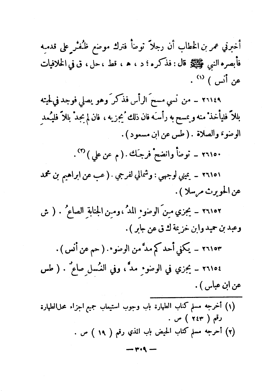 26151- "يميني لوجهي: وشمالي لفرجي". "عب عن إبراهيم بن محمد عن الحويرث مرسلا".