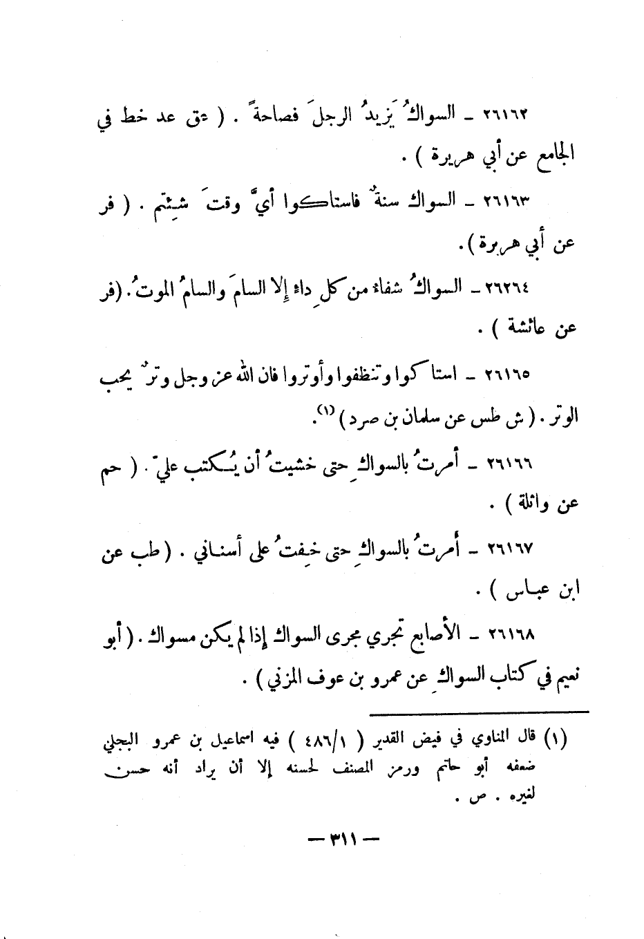 26163- "السواك سنة فاستاكوا أي وقت شئتم". "فر عن أبي هريرة".