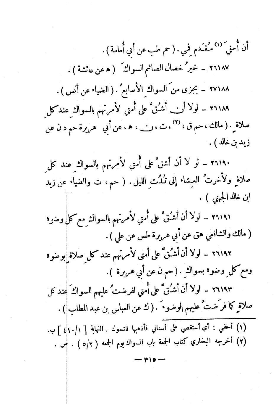26189- "لولا أن أشق على أمتي لأمرتهم بالسواك عند كل صلاة". "مالك، حم ق، 2 ت، ن، هـ، عن أبي هريرة حم د ن عن زيد بن خالد".
