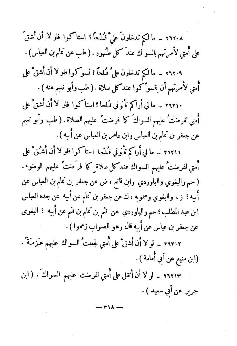 26210- "ما لي أراكم قلحا؟ استاكوا فلولا أن أشق على أمتي لفرضت عليهم السواك كما فرضت عليهم الصلاة". "طب وأبو نعيم عن جعفر بن تمام بن العباس وابن عامر بن العباس عن أبيه".