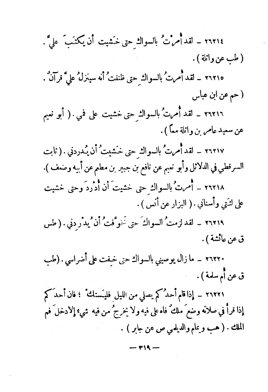 26219- "لقد لزمت السواك حتى تخوفت أن يدردني". "طس ق عن عائشة".