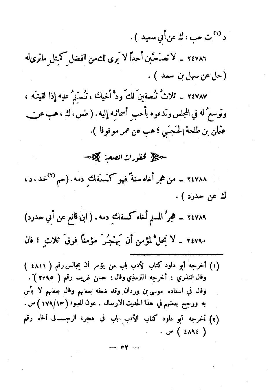 24788- "من هجر أخاه سنة فهو كسفك دمه". "حم "1" خد، د، ك عن حدرد".