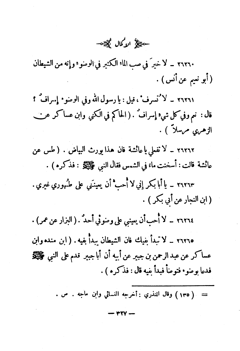 26260 - "لا خير في صب الماء الكثير في الوضوء وإنه من الشيطان". "أبو نعيم عن أنس".