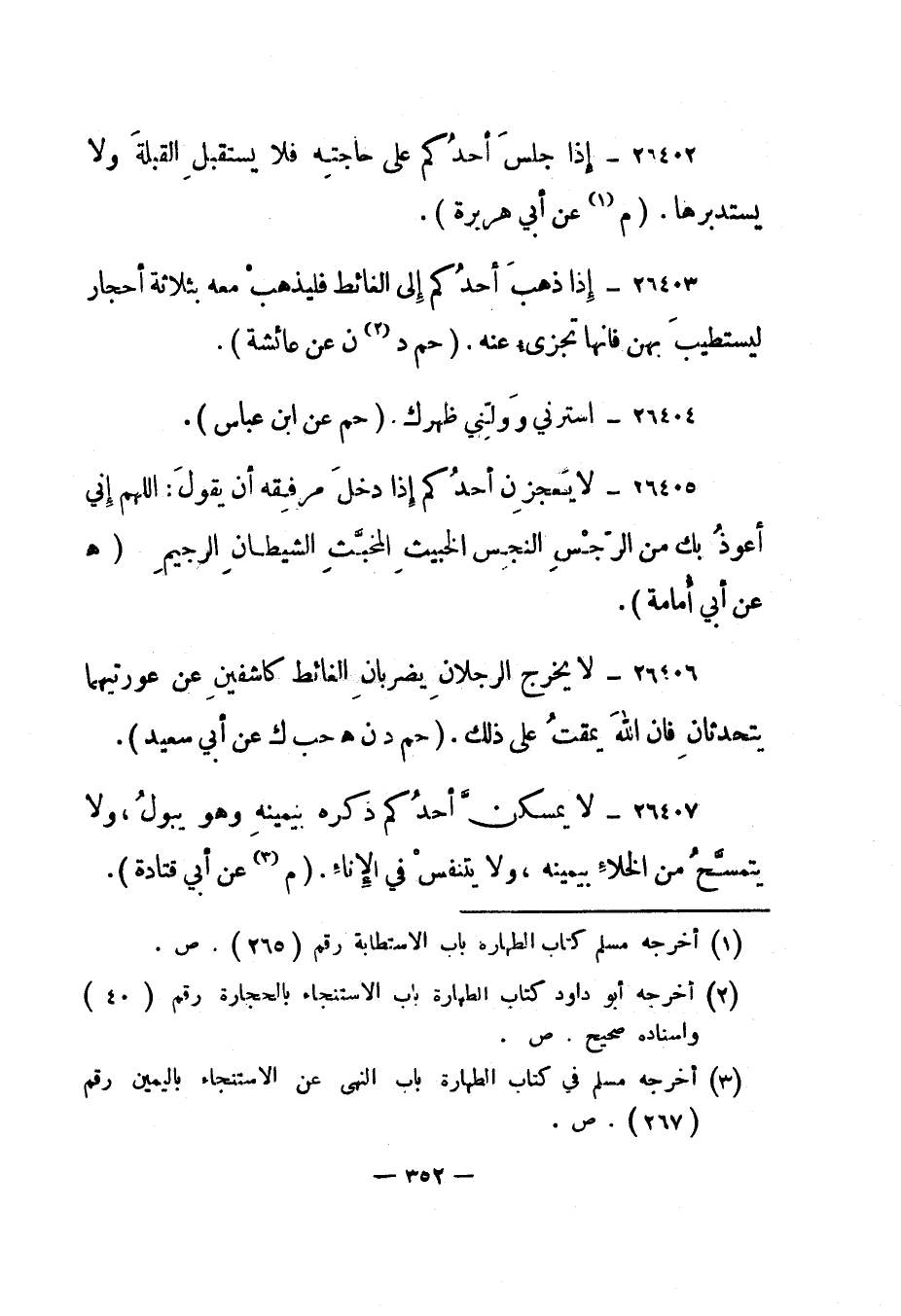 26402- "إذا جلس أحدكم على حاجته فلا يستقبل القبلة ولا يستدبرها". "م 1 عن أبي هريرة".