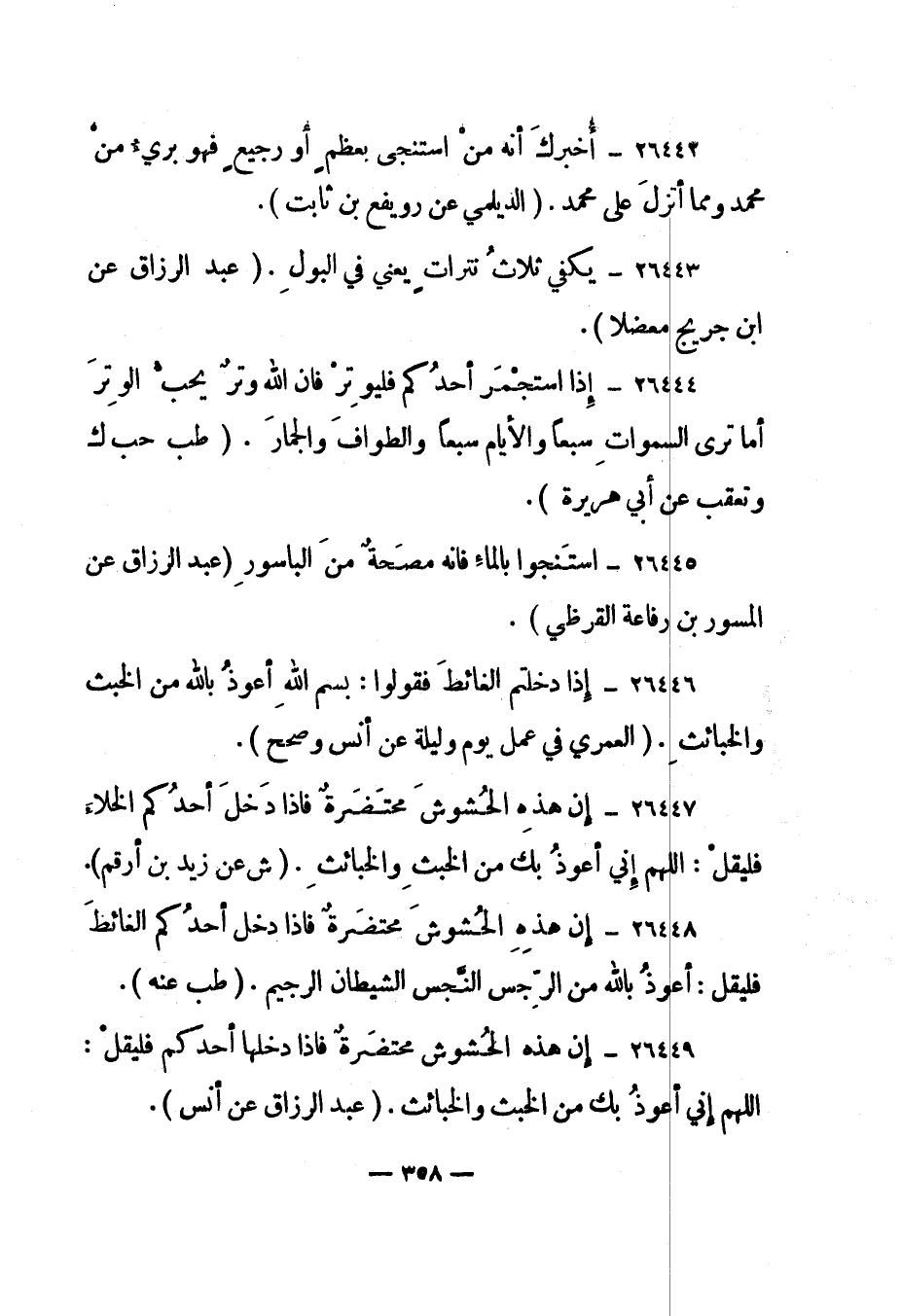 26449- "إن هذه الحشوش محتضرة فإذا دخلها أحدكم فليقل: اللهم إني أعوذ بك من الخبث والخبائث". "عبد الرزاق عن أنس".