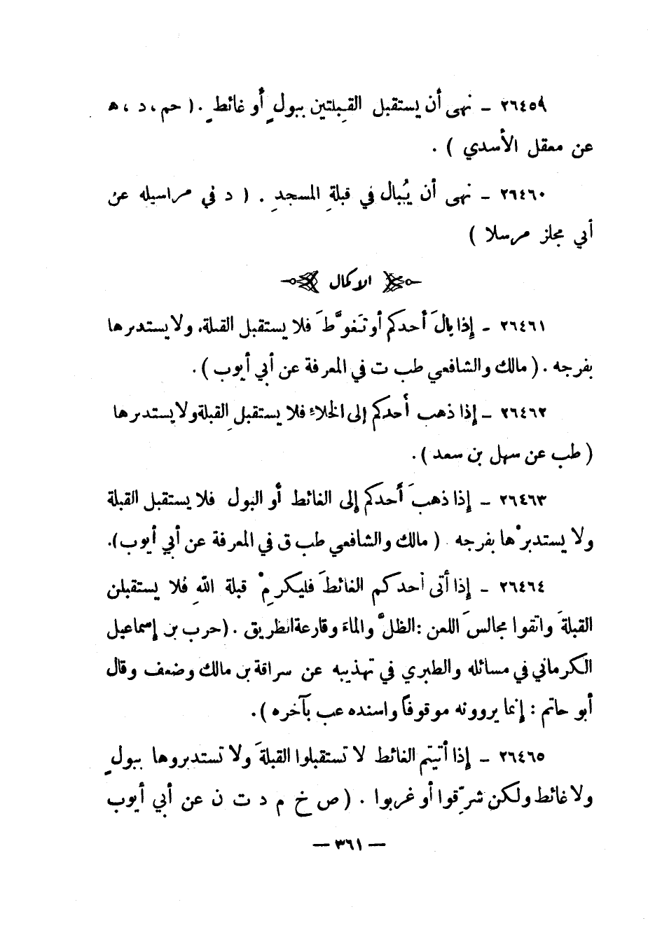 26459- "نهى أن يستقبل القبلتين ببول أو غائط". "حم، د، هـ عن معقل الأسدي".