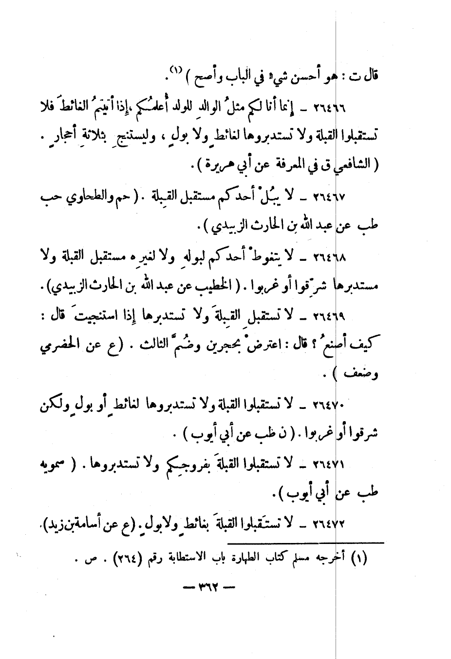 26472- "لا تستقبلوا القبلة بغائط ولا بول". "ع عن أسامة بن زيد".