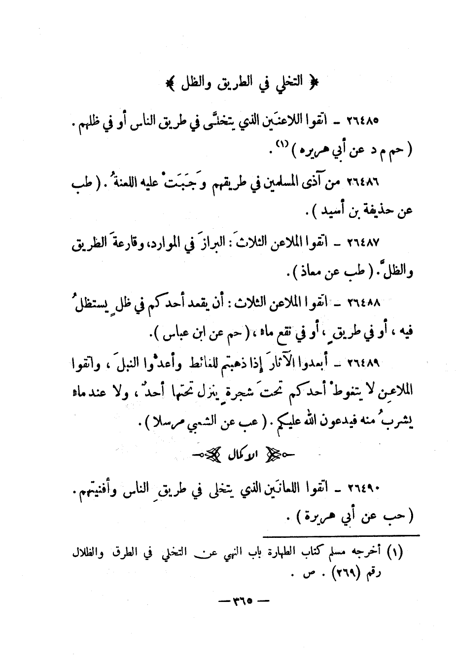 26490- "اتقوا اللعانين الذي يتخلى في طريق الناس وأفنيتهم". "حب عن أبي هريرة".