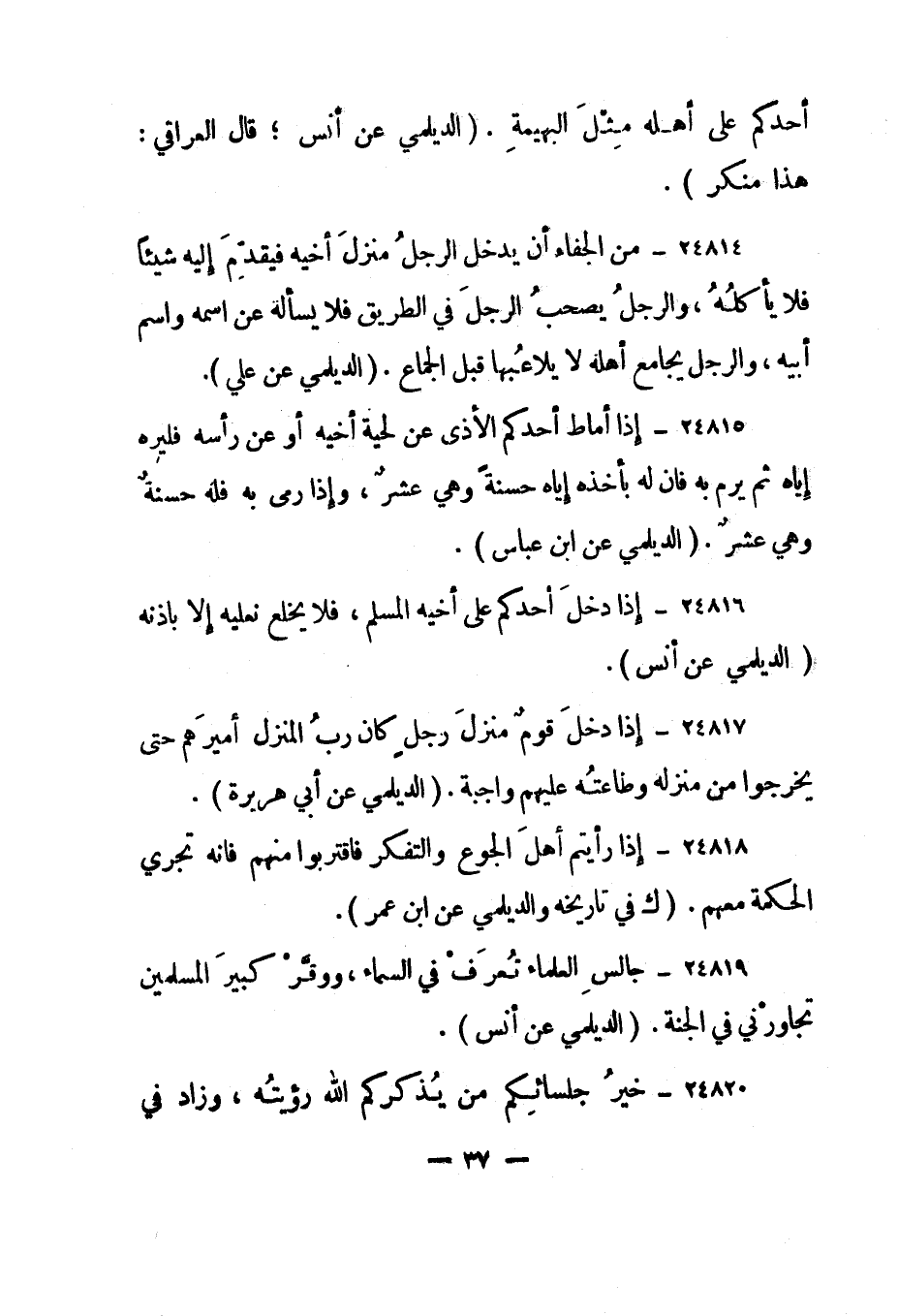 24816- "إذا دخل أحدكم على أخيه المسلم، فلا يخلع نعليه إلا بإذنه". "الديلمي عن أنس".
