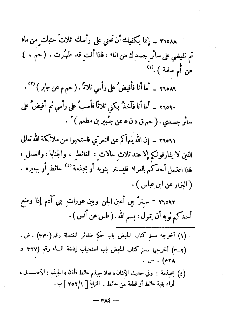26588- "إنما يكفيك أن تحثي على رأسك ثلاق حثيات من ماء ثم تفيضي على سائر جسدك من الماء، فإذا أنت قد طهرت". "حم، 4 عن أم سلمة" 1