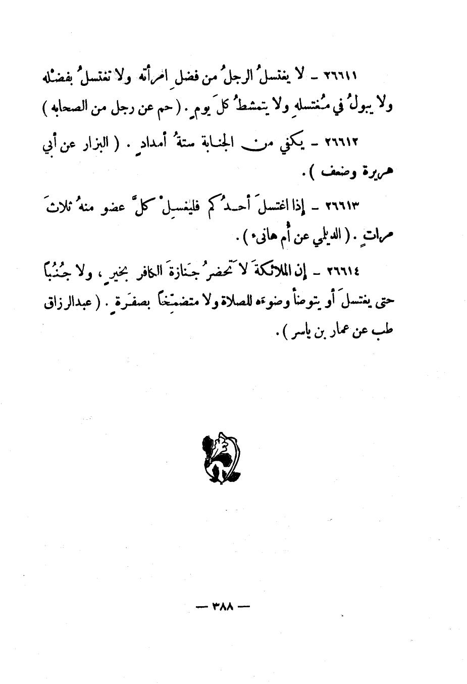 26611- "لا يغتسل الرجل من فضل امرأته ولا تغتسل بفضله ولا يبول في مغتسله ولا يتمشط كل يوم". "حم عن رجل من الصحابة".