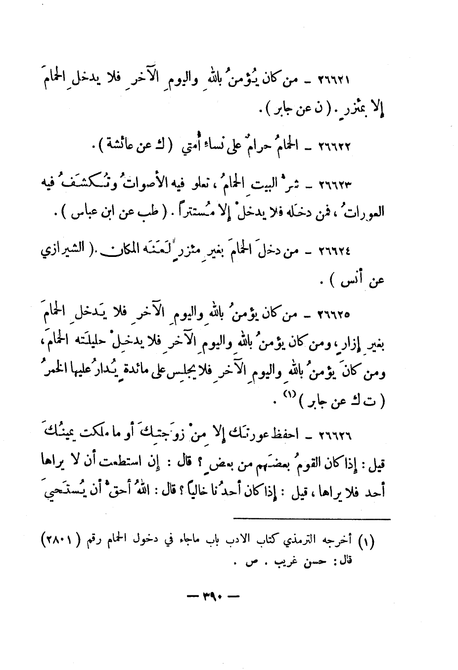 26621- "من كان يؤمن بالله واليوم الآخر فلا يدخل الحمام إلا بمئزر". "ن عن جابر".