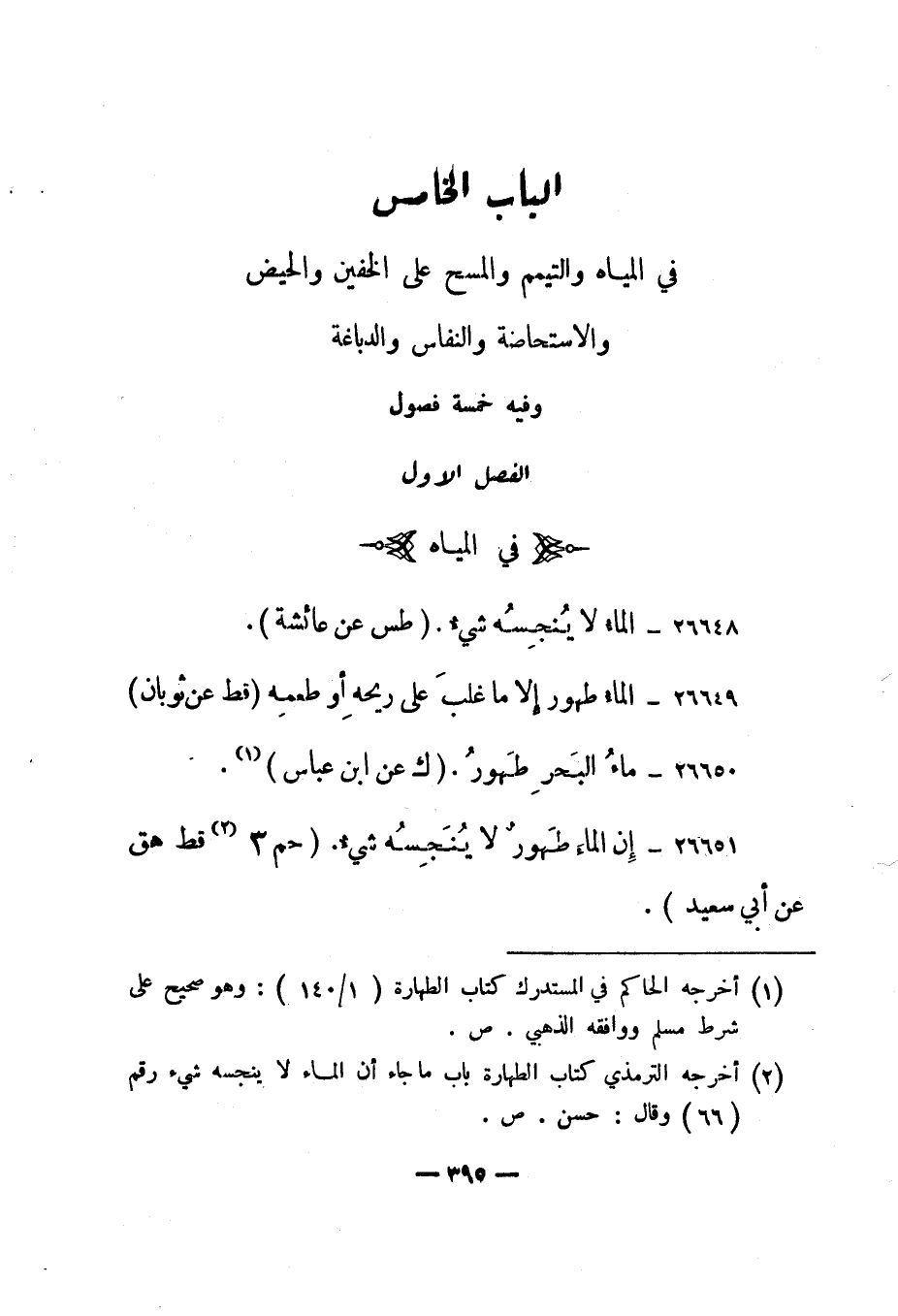 الباب الخامس: في المياه والتيمم والمسح على الخفين والحيض والاستحاضة والنفاس والدباغة