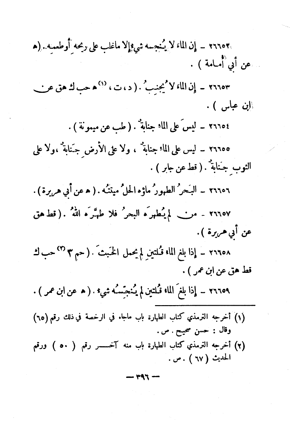 26652- "إن الماء لا ينجسه شيء إلا ما غلب على ريحه أو طعمه". "هـ عن أبي أمامة".