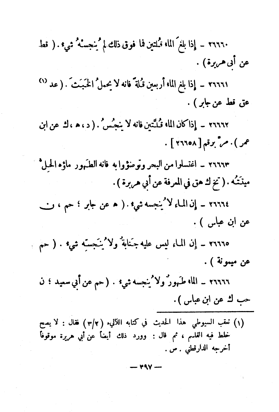 26660- "إذا بلغ الماء قلتين فما فوق ذلك لم ينجسه شيء"."قط عن أبي هريرة".