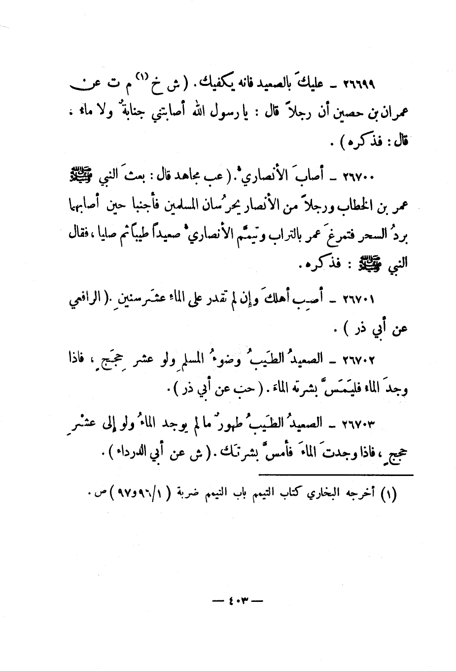 26703- "الصعيد الطيب طهور ما لم يوجد الماء ولو إلى عشر حجج، فإذا وجدت الماء فأمس بشرتك". "ش عن أبي الدرداء".