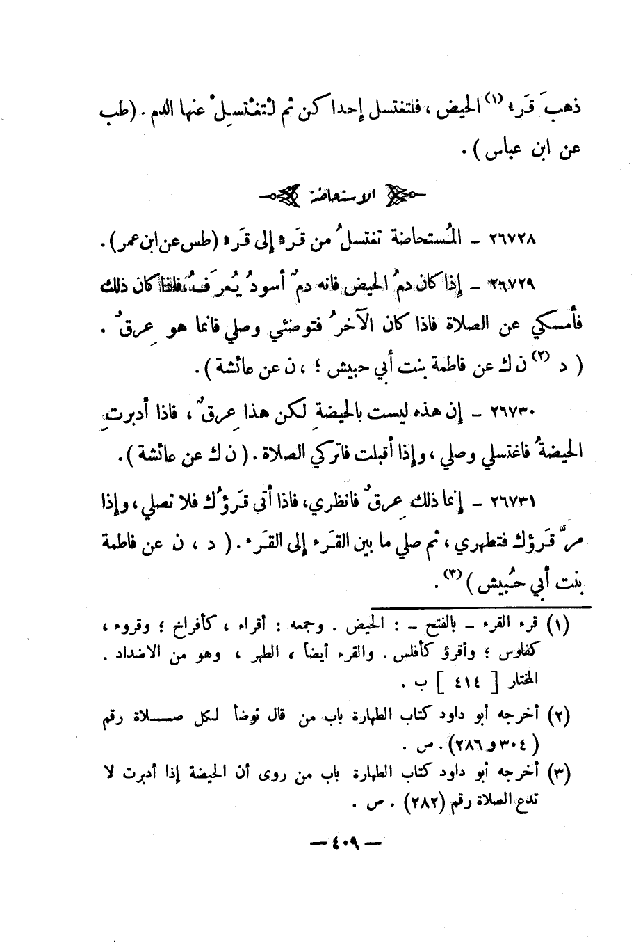 26730- "إن هذه ليست بالحيضة لكن هذا عرق، فإذا أدبرت الحيضة فاغتسلي وصلي، وإذا أقبلت فاتركي الصلاة". "ن ك عن عائشة".
