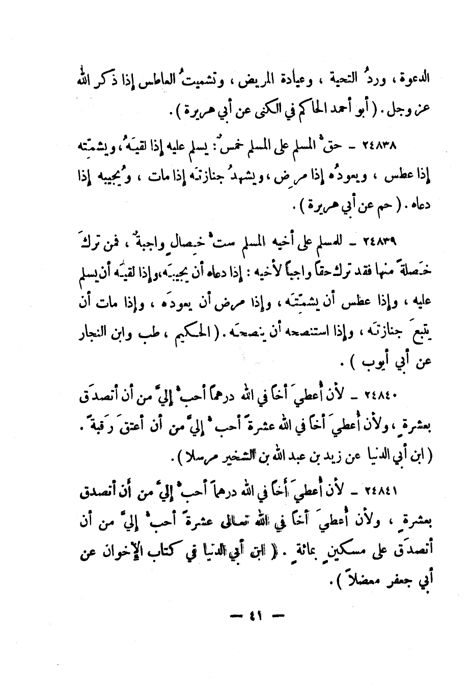 24838- "حق المسلم على المسلم خمس: يسلم عليه إذا لقيه، ويشمته إذا عطس، ويعوده إذا مرض، ويشهد جنازته إذا مات، ويجيبه إذا دعاه". "حم عن أبي هريرة".