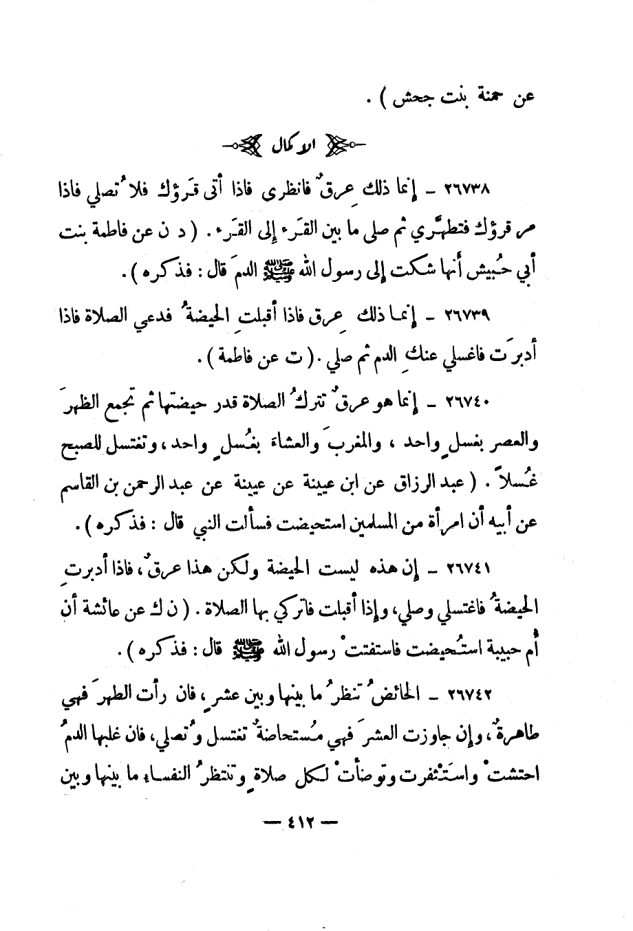26740- "إنما هو عرق تترك الصلاة قدر حيضتها ثم تجمع الظهر والعصر بغسل واحد، والمغرب والعشاء بغسل واحد، وتغتسل للصبح غسلا". "عبد الرزاق عن ابن عيينة عن عيينة عن عبد الرحمن بن القاسم عن أبيه أن "امرأة من المسلمين استحيضت فسألت النبي صلى الله عليه وسلم قال: فذكره".