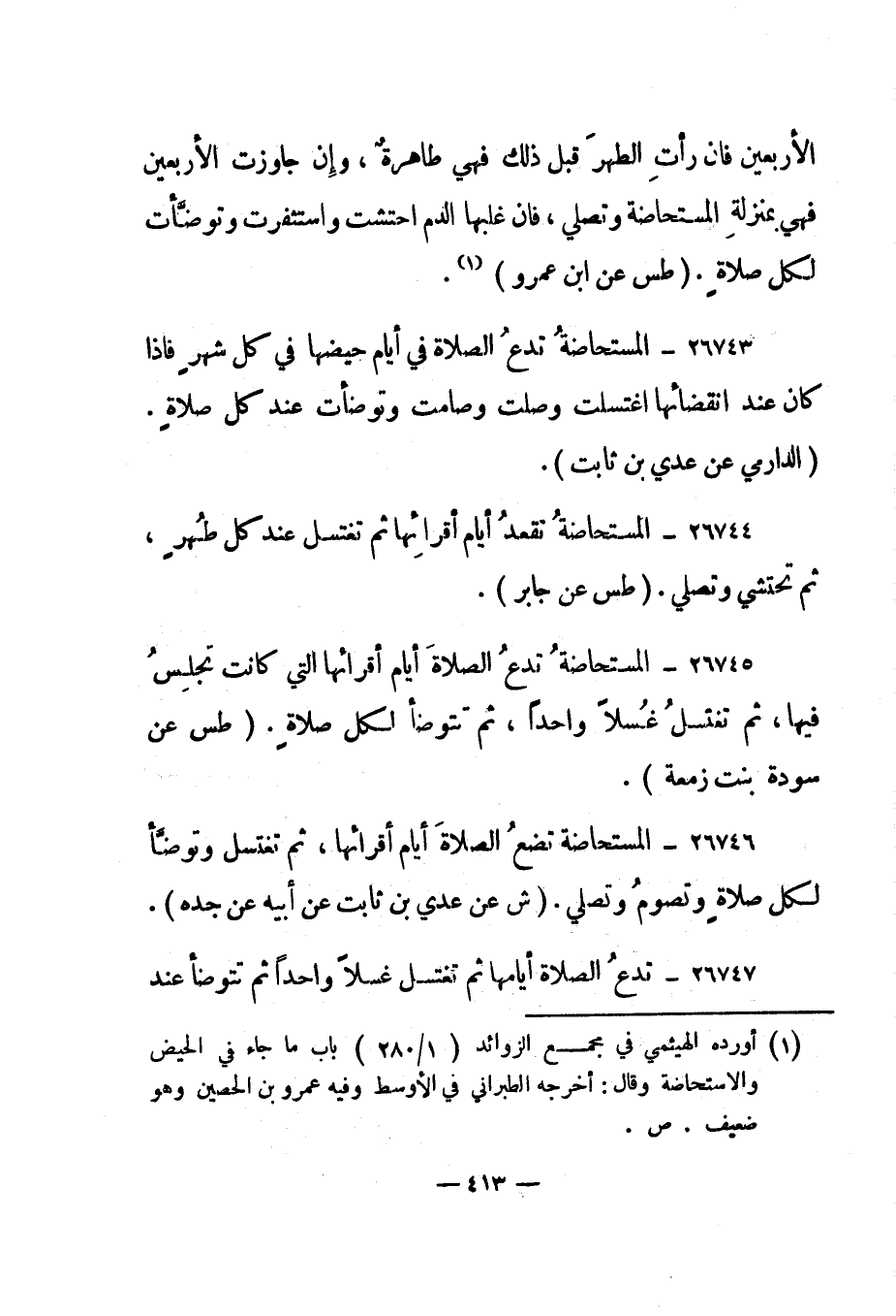 26743- "المستحاضة تدع الصلاة في أيام حيضها في كل شهر فإذا كان عند انقضائها اغتسلت وصلت وصامت وتوضأت عند كل صلاة". "الدارمي عن عدي بن ثابت".