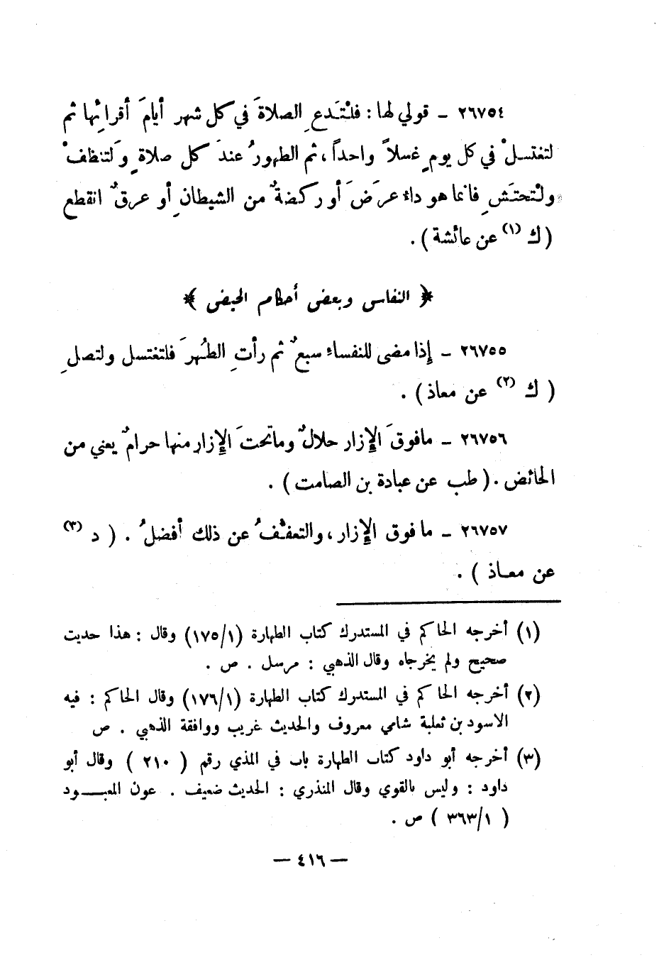 26757- "ما فوق الإزار، والتعفف عن ذلك أفضل". "د 3 عن معاذ".