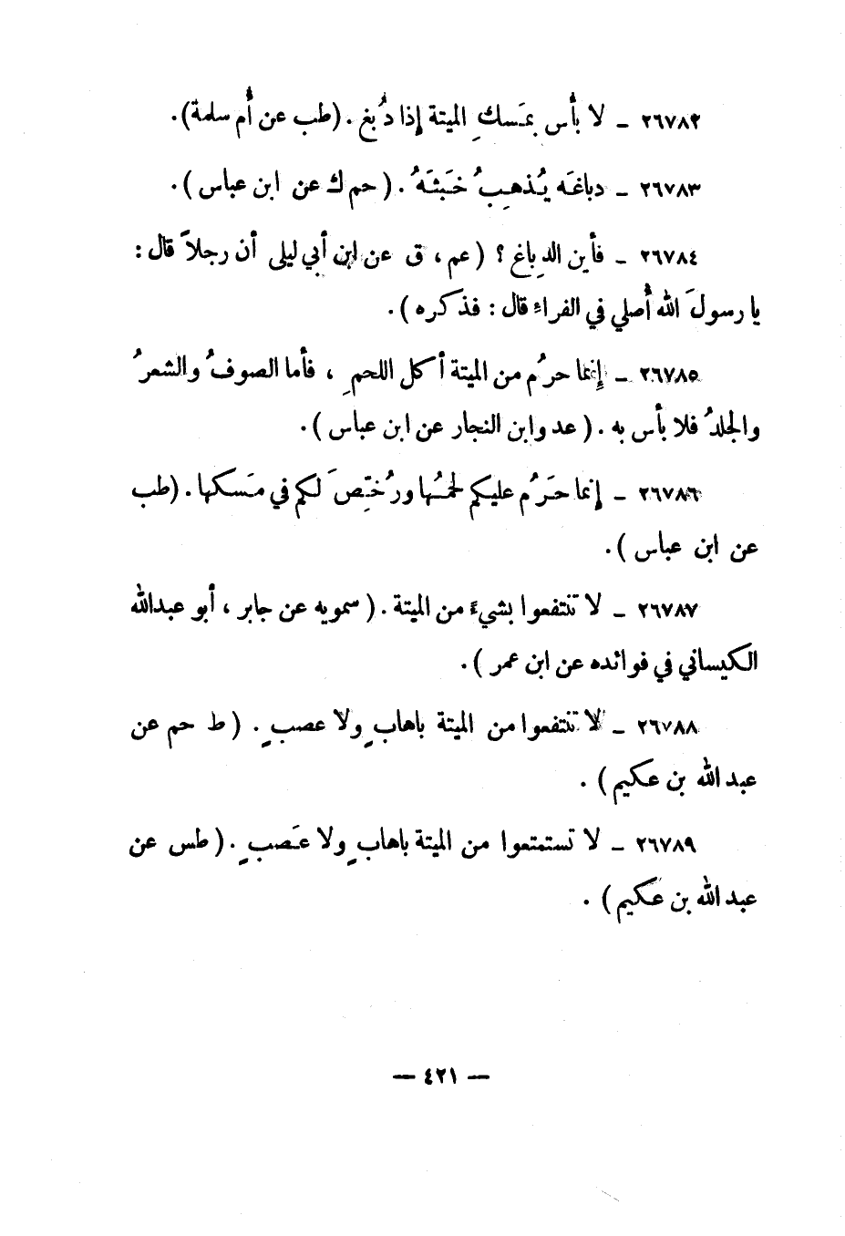 26789- "لا تستمتعوا من الميتة بإهاب ولا عصب". "طس عن عبد الله بن عكيم".