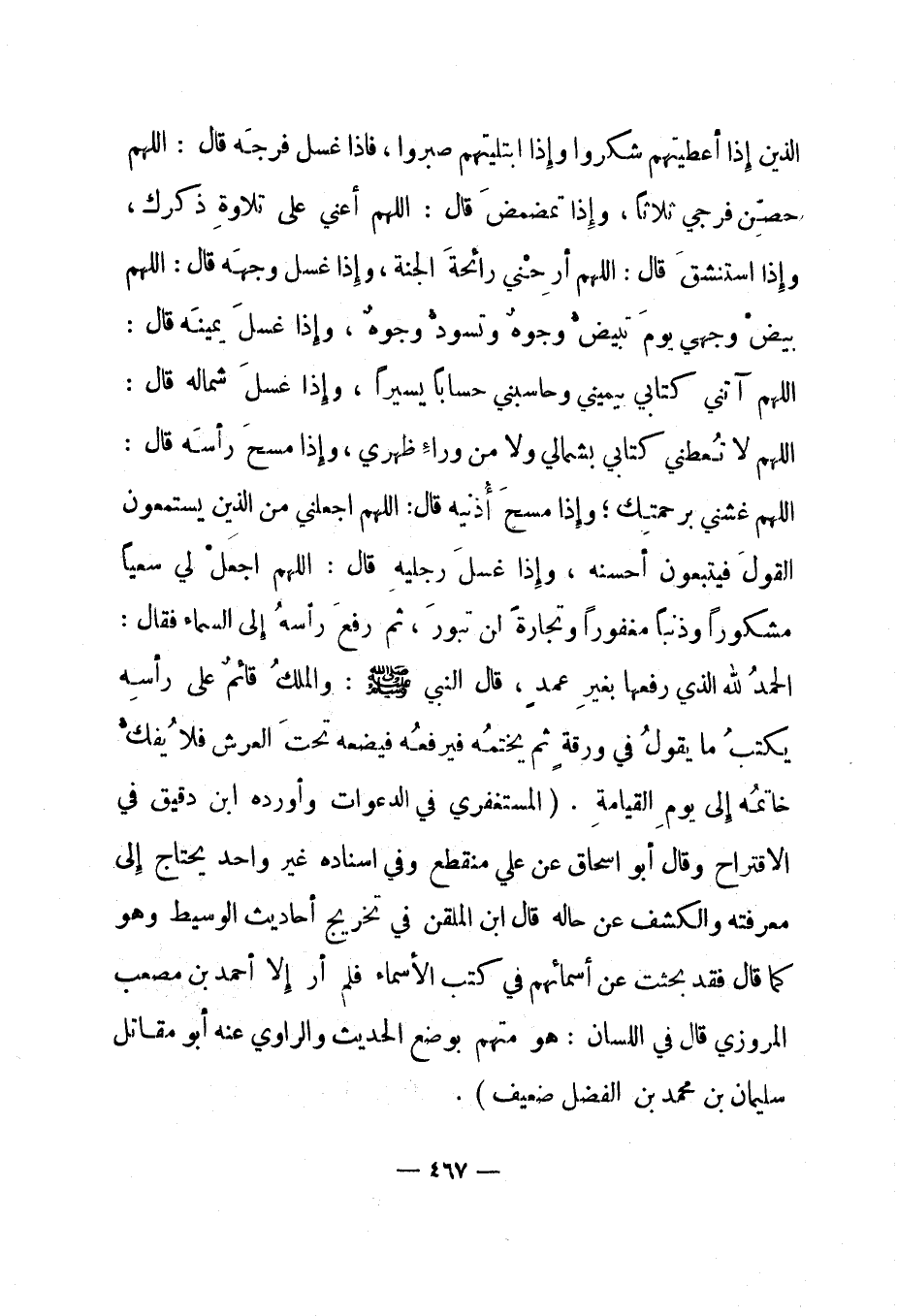 الذين إذا أعطيتهم شكروا وإذا ابتليتهم صبروا، فإذا غسل فرجه قال: اللهم حصن فرجي ثلاثا، وإذا تمضمض قال: اللهم أعني على تلاوة ذكرك، وإذا استنشق قال: اللهم أرحني رائحة الجنة، وإذا غسل وجهه قال: اللهم بيض وجهي يوم تبيض وجوه وتسود وجوه، وإذا غسل يمينه قال: اللهم آتني كتابي بيميني وحاسبني حسابا يسيرا، وإذا غسل شماله قال: اللهم لا تعطني كتابي بشمالي ولا من وراء ظهري، وإذا مسح رأسه قال: اللهم غشني برحمتك؛ وإذا مسح أذنيه قال: اللهم اجعلني من الذين يستمعون القول فيتبعون أحسنه، وإذا غسل رجليه قال: اللهم اجعل لي سعيا مشكورا وذنبا مغفورا وتجارة لن تبور، ثم رفع رأسه إلى السماء فقال: الحمد لله الذي رفعها بغير عمد، قال النبي صلى الله عليه وسلم: والملك قائم على رأسه يكتب ما يقول في ورقة ثم يختمه فيرفعه فيضعه تحت العرش فلا يفك خاتمه إلى يوم القيامة". "المستغفري في الدعوات وأورده ابن دقيق في الاقتراح وقال أبو إسحاق عن علي منقطع وفي إسناده غير واحد يحتاج إلى معرفته والكشف عن حاله قال ابن الملقن في تخريج أحاديث الوسيط وهو كما قال فقد بحثت عن أسمائهم في كتب الأسماء فلم أر إلا أحمد بن مصعب المروزي قال في اللسان: هو متهم بوضع الحديث والراوي عنه أبو مقاتل سليمان بن محمد بن الفضل ضعيف".
