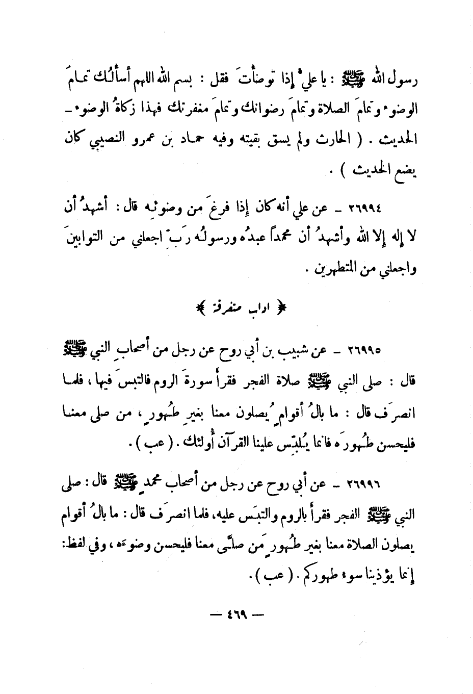 26994- عن علي أنه "كان إذا فرغ من وضوئه قال: أشهد أن لا إله إلا الله وأشهد أن محمدا عبده ورسوله رب اجعلني من التوابين واجعلني من المتطهرين".