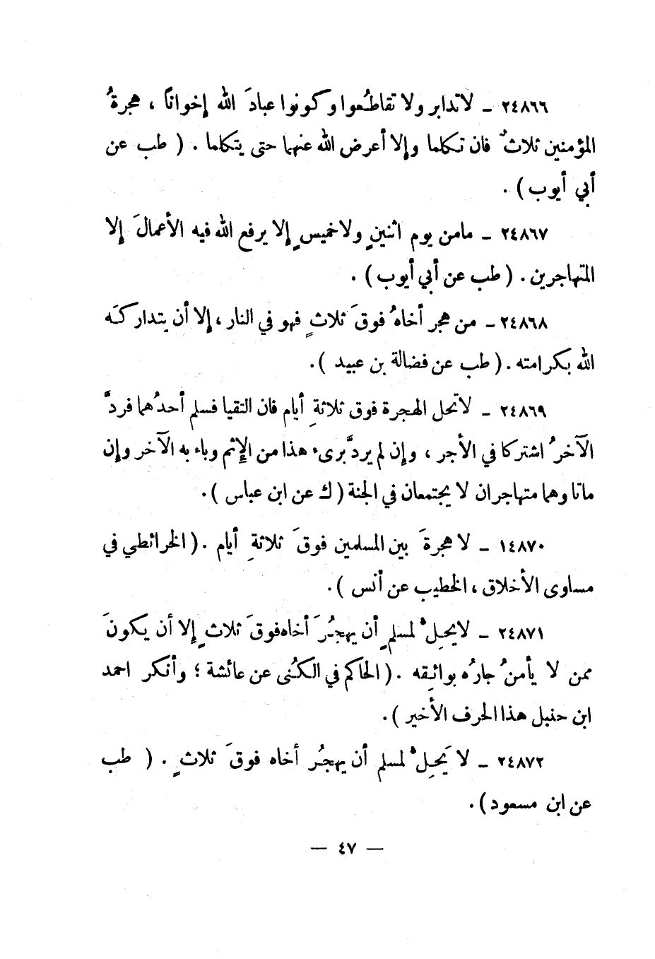 24870- "لا هجرة بين المسلمين فوق ثلاثة أيام". "الخرائطي في مساوى الأخلاق، الخطيب عن أنس".