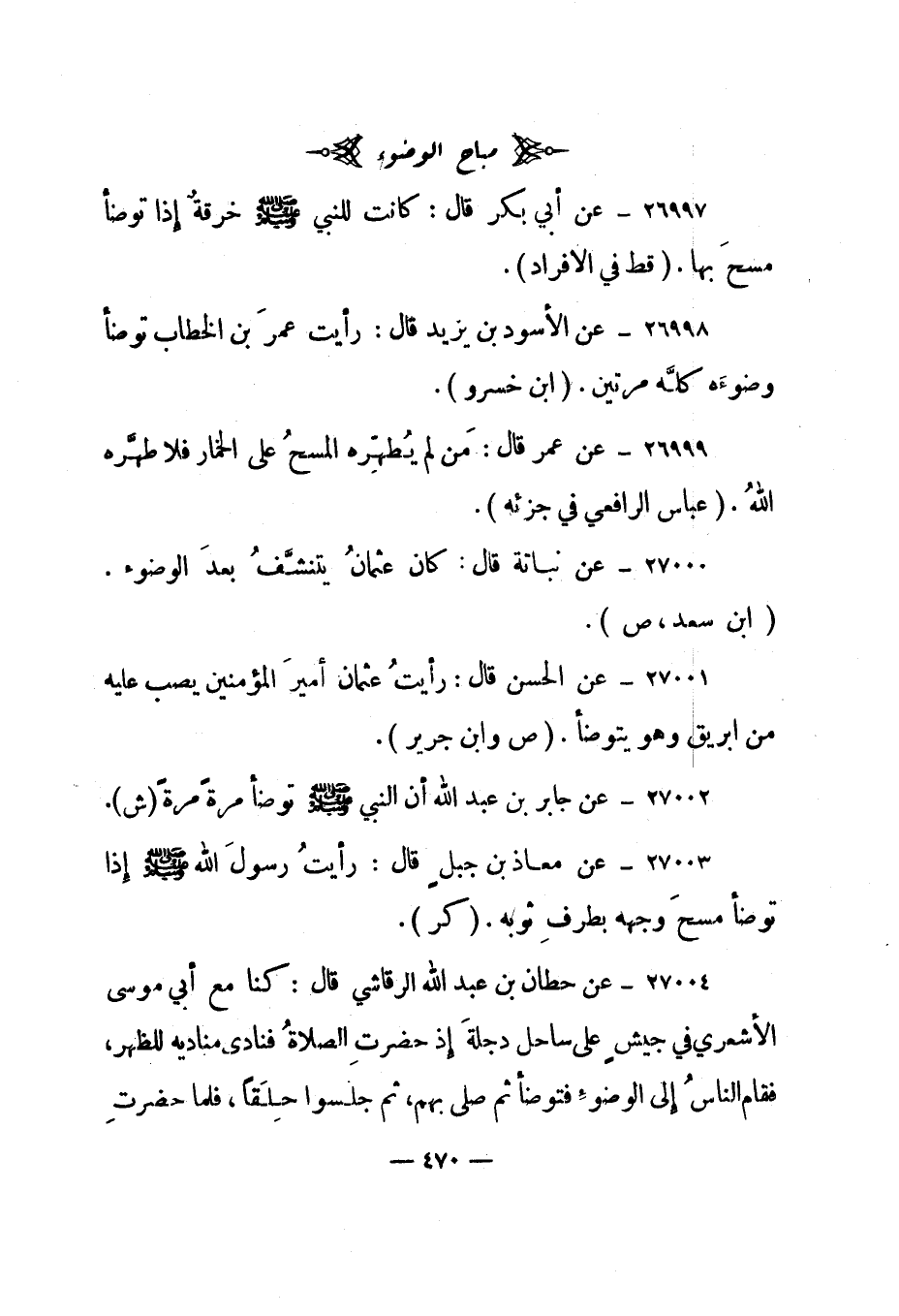 27000- عن نباتة قال: "كان عثمان يتنشف بعد الوضوء". "ابن سعد، ص".