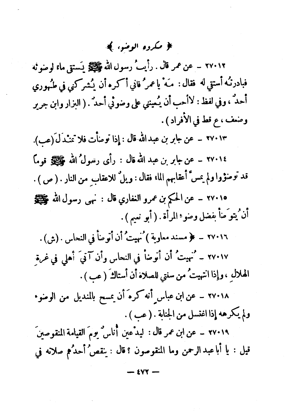 27016- "مسند معاوية" نهيت أن أتوضأ في النحاس."ش".