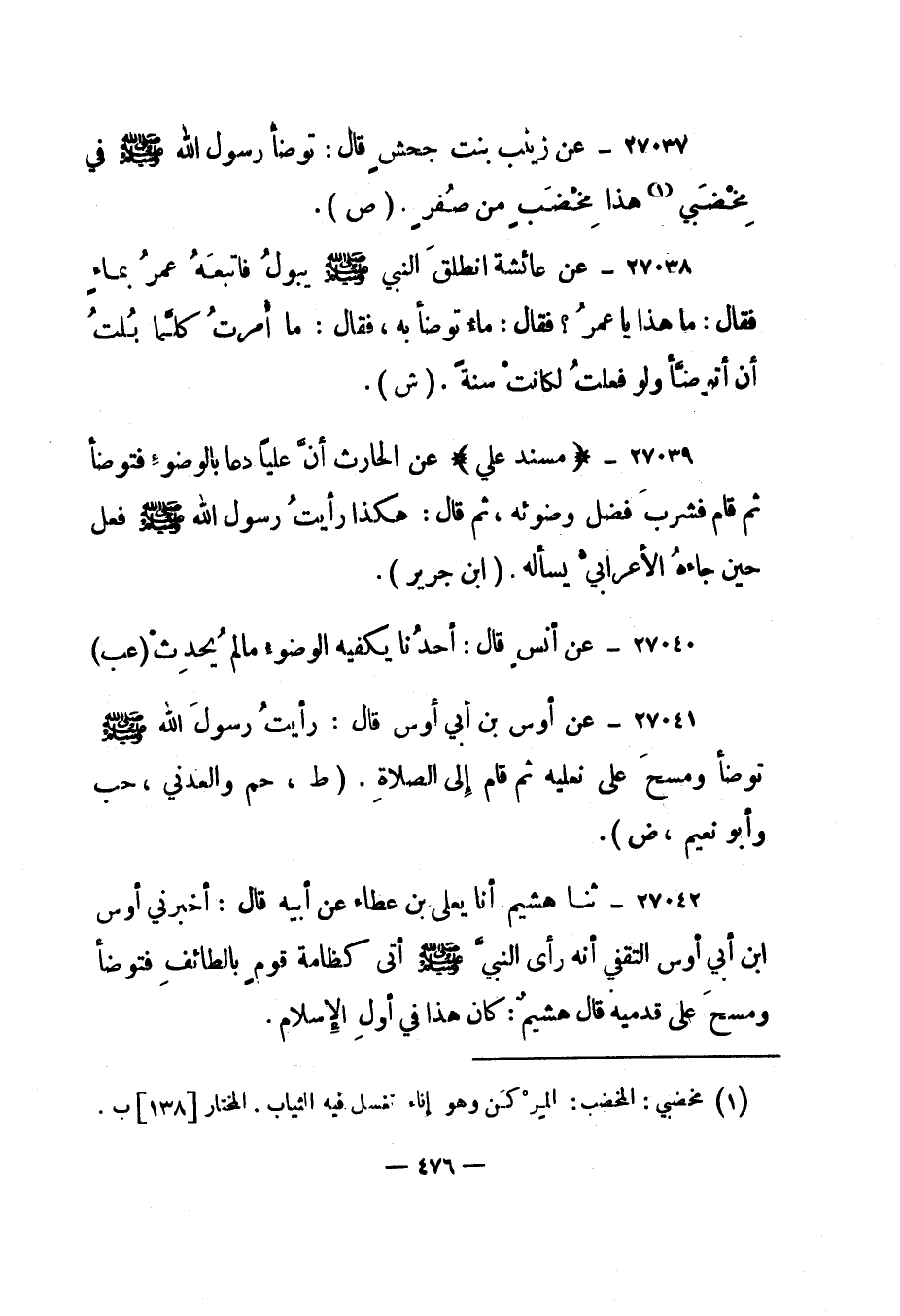 27037- عن زينب بنت جحش قال: "توضأ رسول الله صلى الله عليه وسلم في مخضبي 1 هذا مخضب من صفر. "ص.