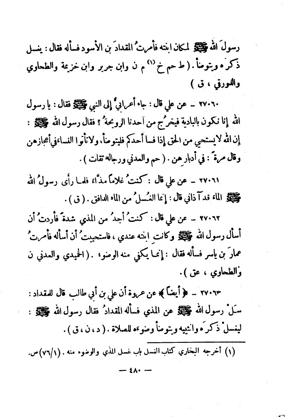 رسول الله صلى الله عليه وسلم لمكان ابنته فأمرت المقداد بن الأسود فسأله فقال: "يغسل ذكره ويتوضأ". "ط حم خ 1 م ن وابن جرير وابن خزيمة والطحاوي والدورقي، ق".