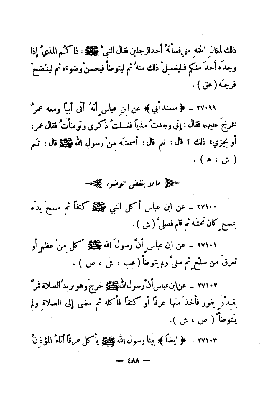 27099- "مسند أبي" عن ابن عباس أنه أتى أبيا ومعه عمر فخرج عليهما فقال: إني وجدت مذيا فغسلت ذكرى وتوضأت فقال عمر: أو يجزيء ذلك؟ قال: نعم قال: أسمعته من رسول الله صلى الله عليه وسلم قال: نعم."ش، هـ".