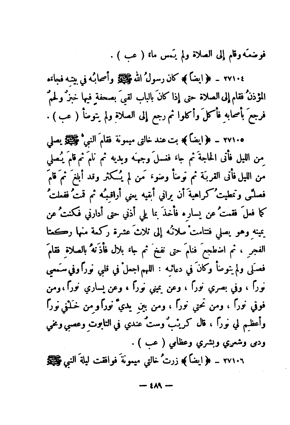 27105- "أيضا" "بت عند خالتي ميمونة فقام النبي صلى الله عليه وسلم يصلي من الليل فأتى الحاجة ثم جاء فغسل وجهه ويديه ثم نام ثم قام يصلي من الليل فأتى القربة ثم توضأ وضوء من لم يكثر وقد أبلغ ثم قام فصلى وتمطيت كراهية أن يراني أبقيه يعني أراقبه ثم قمت ففعلت كما فعل فقمت عن يساره فأخذ بما يلي أذني حتى أدارني فكنت عن يمينه وهو يصلي فتتامت صلاته إلى ثلاث عشرة ركعة منها ركعتا الفجر، ثم اضطجع فنام حتى نفخ ثم جاء بلال فأذنه بالصلاة فقام فصلى ولم يتوضأ وكان في دعائه: "اللهم اجعل في قلبي نورا وفي سمعي نورا، وفي بصري نورا، وعن يميني نورا، وعن يساري نورا، ومن فوقي نورا، ومن تحتي نورا، ومن بين يدي نورا ومن خلفي نورا وأعظم لي نورا"، قال كريب وست عندي في التابوت وعصبي ومخي ودمى وشعري وبشري وعظامي". "عب".