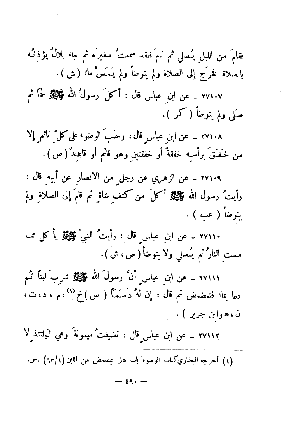 27107- عن ابن عباس قال: "أكل رسول الله صلى الله عليه وسلم لحما ثم صلى ولم يتوضأ". "كر".