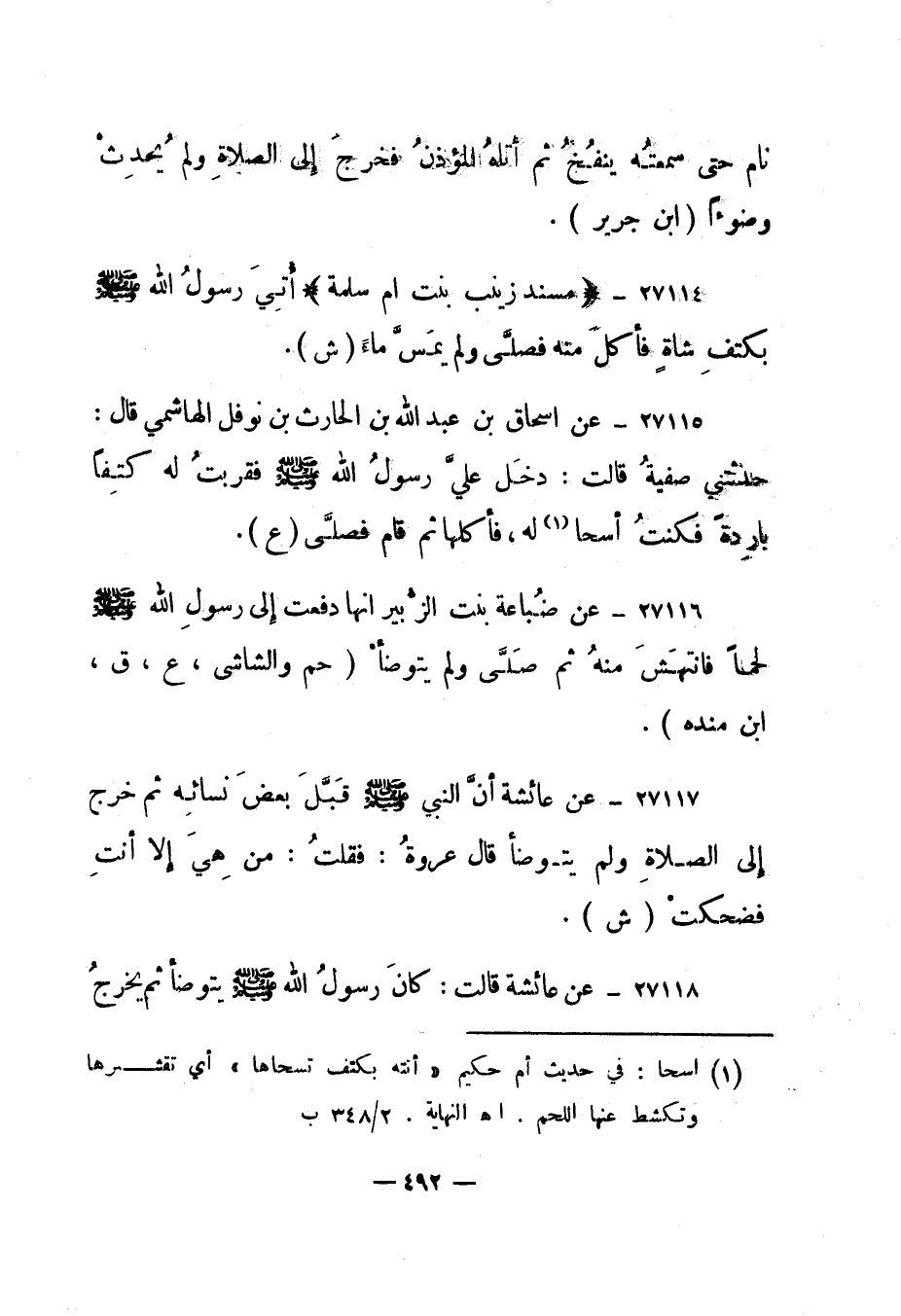 27115- عن إسحاق بن عبد الله بن الحارث بن نوفل الهاشمي قال: حدثتني صفية قالت: "دخل علي رسول الله صلى الله عليه وسلم فقربت له كتفا باردة فكنت أسحا 1 له، فأكلها ثم قام فصلى."ع".