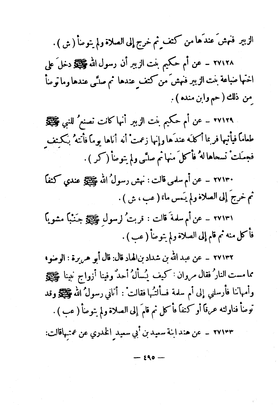 27128- عن أم حكيم بنت الزبير "أن رسول الله صلى الله عليه وسلم دخل على أختها ضباعة بنت الزبير فنهش من كتف عندها ثم صلى عندها وما توضأ من ذلك". "حم وابن منده".