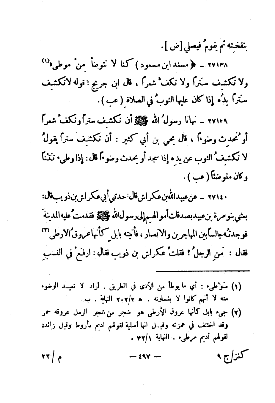 27138- "مسند ابن مسعود" "كنا لا نتوضأ من موطئ 1 ولا نكشف سترا ولا نكف شعرا، قال ابن جريج: قوله لا نكشف سترا يده إذا كان عليها الثوب في الصلاة". "عب".