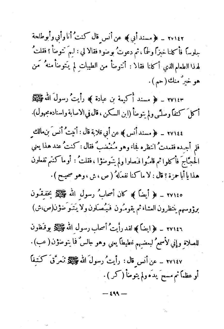 27144- "مسند أنس" عن أبي قلابة قال: "أتيت أنس بن مالك فلم أجده فقعدت انتظره فجاء وهو مغضب فقال: كنت عند هذا يعني الحجاج فأكلوا ثم قاموا فصلوا ولم يتوضؤا، فقلت: أو ما كنتم تفعلون هذا يا أبا حمزة؟ قال: لا ما كنا نفعله". "ص، ش، وهو صحيح".
