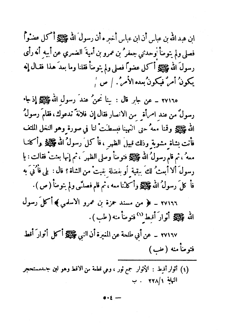 27166- "من مسند حمزة بن عمرو الأسلمي" "أكل رسول الله صلى الله عليه وسلم أثوار أقط 1 فتوضأ منه". "طب".