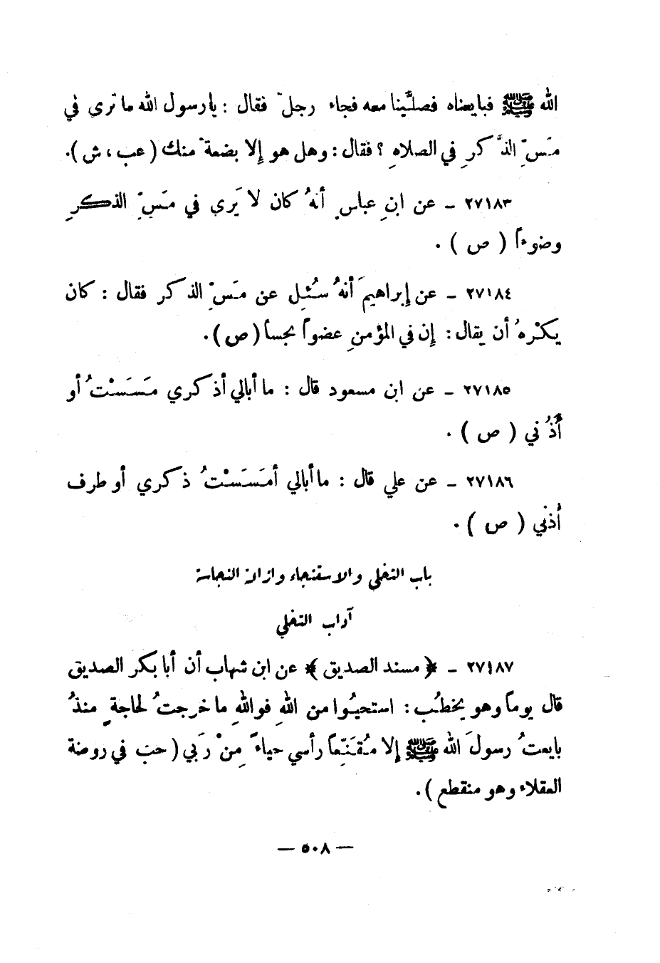 27186- عن علي قال: "ما أبالي أمسست ذكري أو طرف أذني".